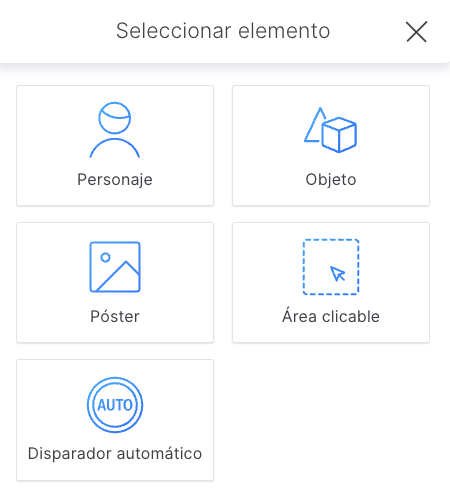 - Haz clic en “+ Elemento” (el botón para añadir un elemento) que corresponda a la escena en la que quieres añadirlo.