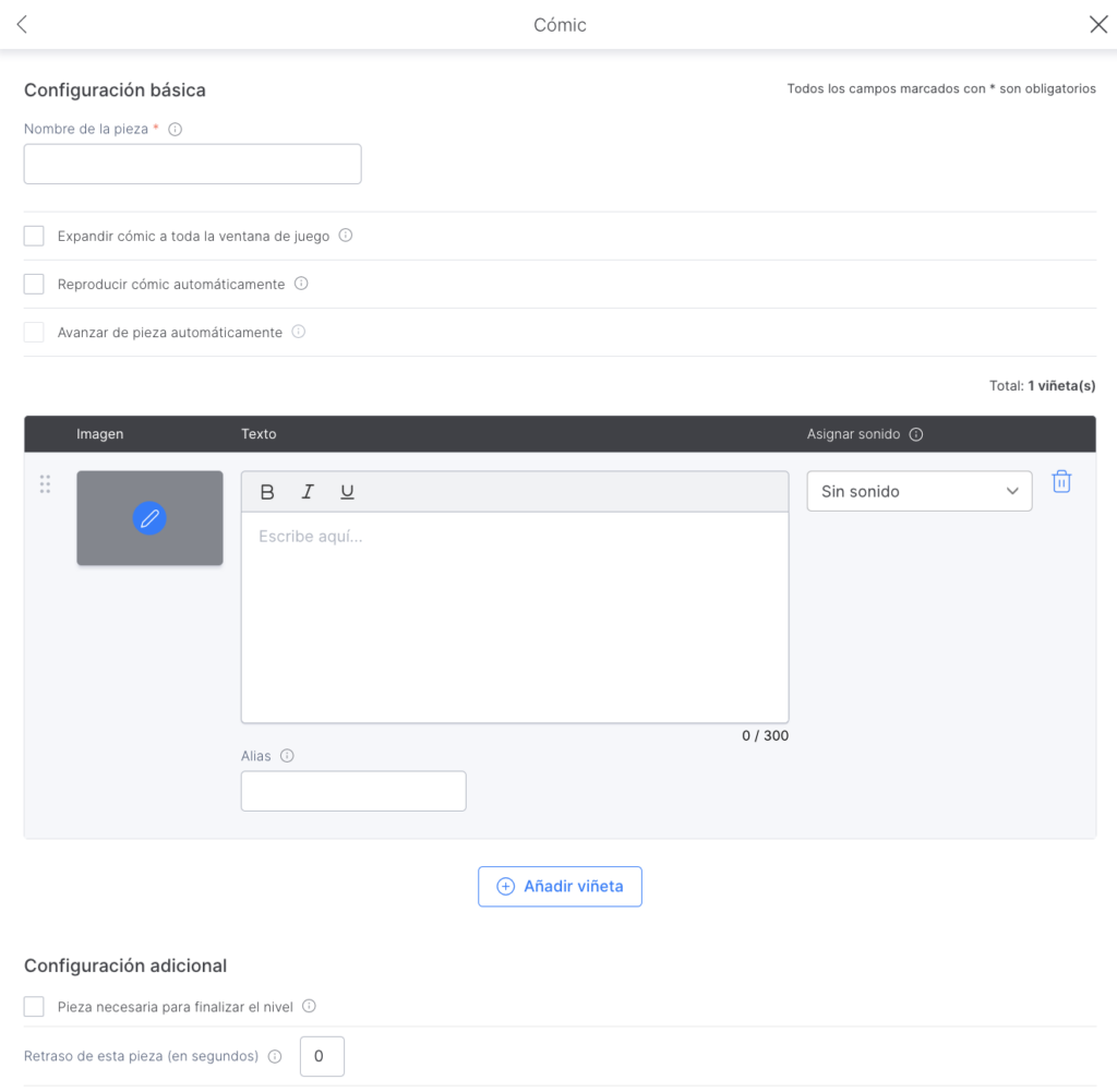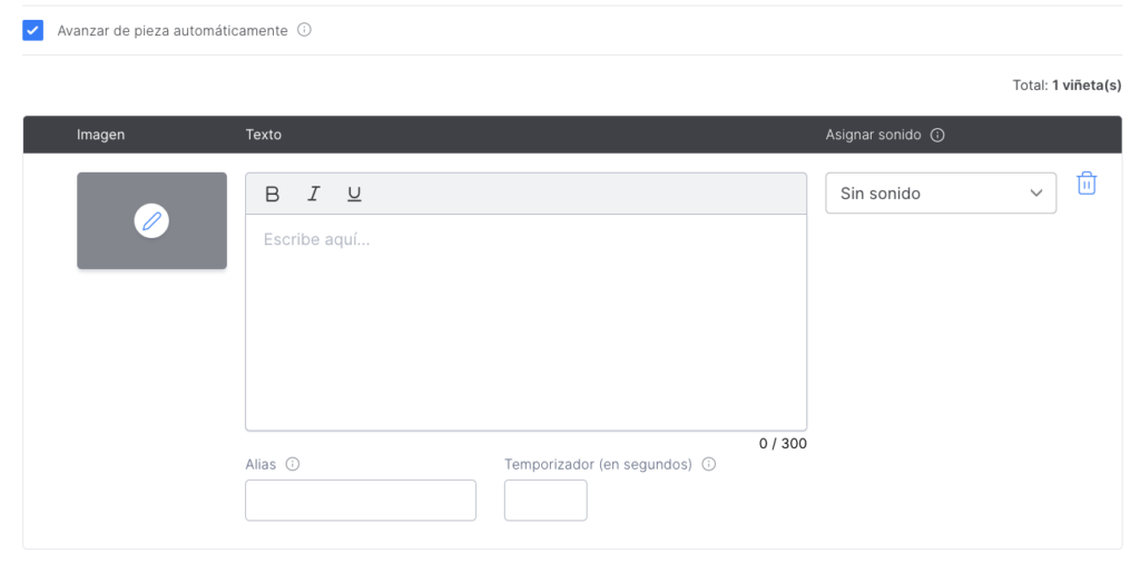 La pieza “Cómic” se compone de una sucesión de imágenes, videos o gifs a los que podrás añadir un texto y/o un audio, si lo deseas.