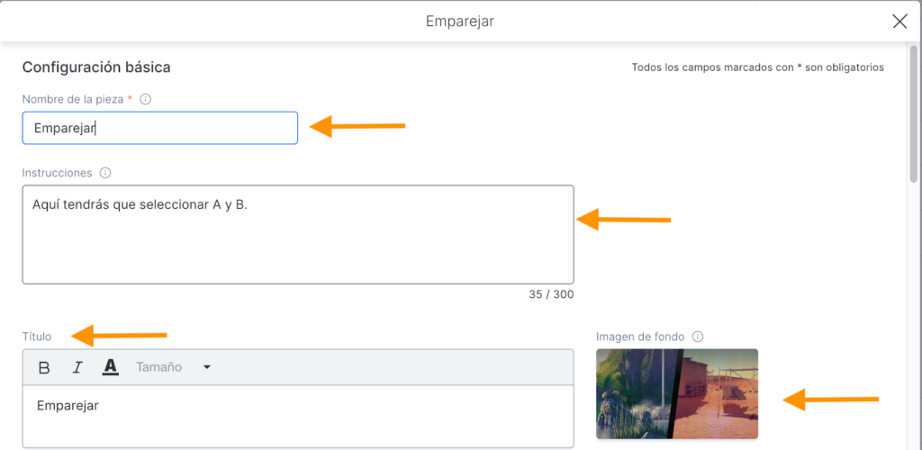 Esta pieza permite crear una actividad interactiva en la que el jugador debe unir elementos de dos listas diferentes, que pueden ser textos o tarjetas con imágenes y/o textos. El objetivo es relacionar correctamente cada elemento de la columna 1 con su correspondiente en la columna 2, formando pares uno a uno. Es una mecánica clásica ideal para reforzar conceptos, vocabulario, asociaciones visuales y aprendizaje activo.