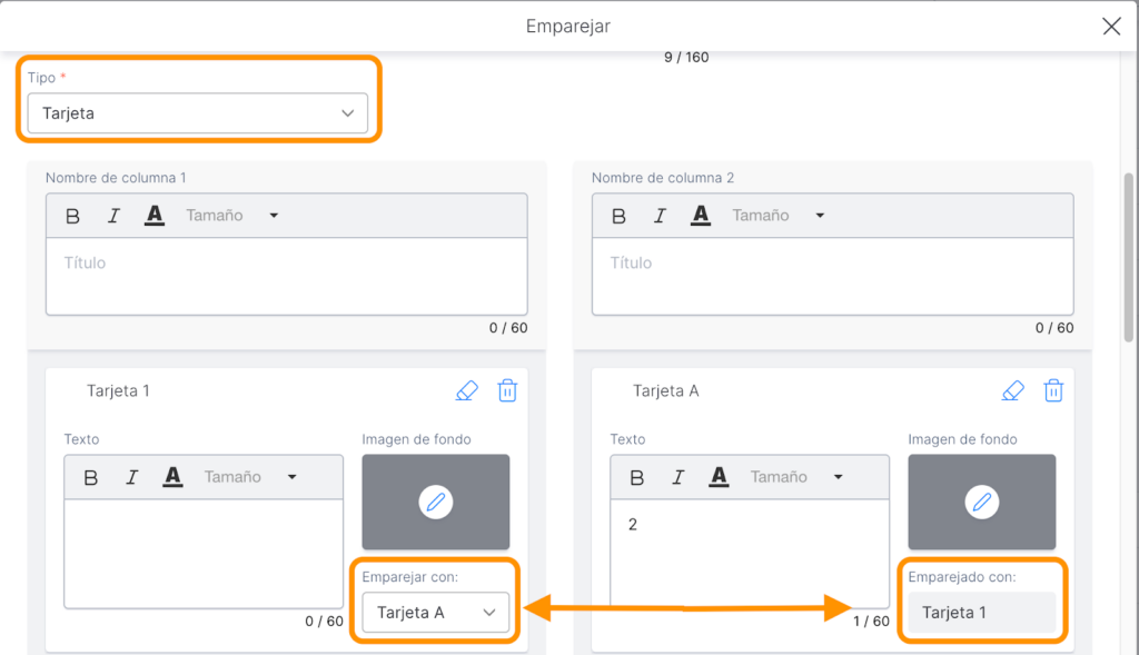 1. Selecciona los elementos que deseas emparejar: tarjeta o texto. Recuerda que este paso es obligatorio, ya que define el formato de tu actividad.