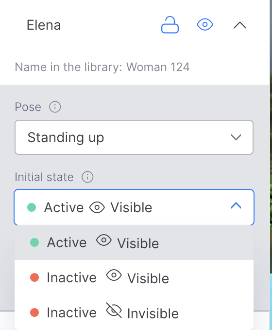 - If you want a character not to be present at the beginning of a scene but appear later, you can set their initial state to âinactive, invisible,â and later add the âActivateâ building block to have them appear.