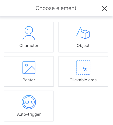 There are five types of elements that can be added to a scene, and each of them can act as a trigger for the action in your game.