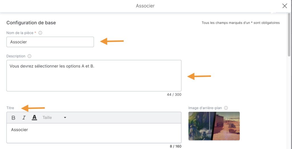 - Message de bonne réponse : message qui s’affichera si le joueur associe correctement les éléments. Il peut être personnalisé pour chaque paire.