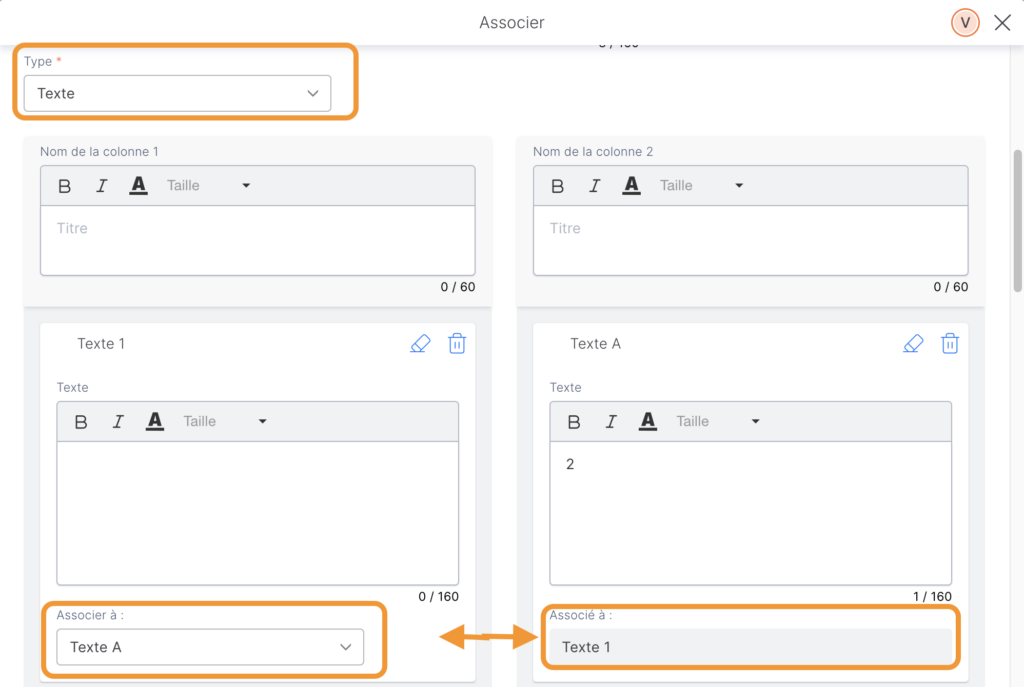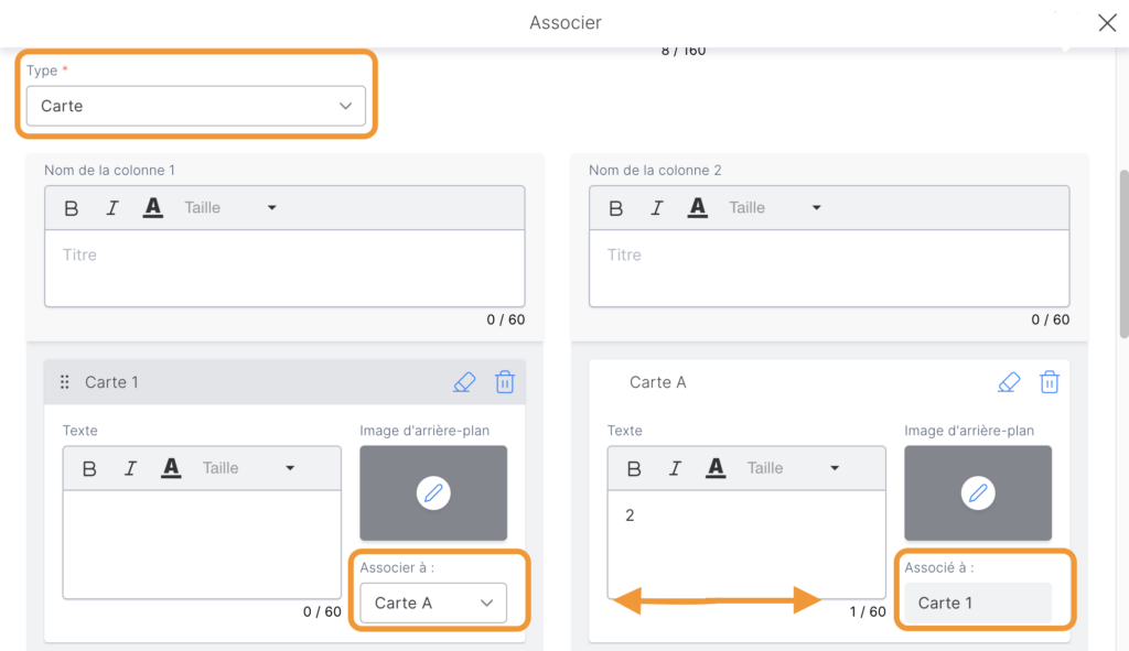 - Ajoutez ensuite le texte ou la fiche correspondante dans les colonnes 1 et 2. Vous pouvez créer un maximum de 10 textes (ou fiches).