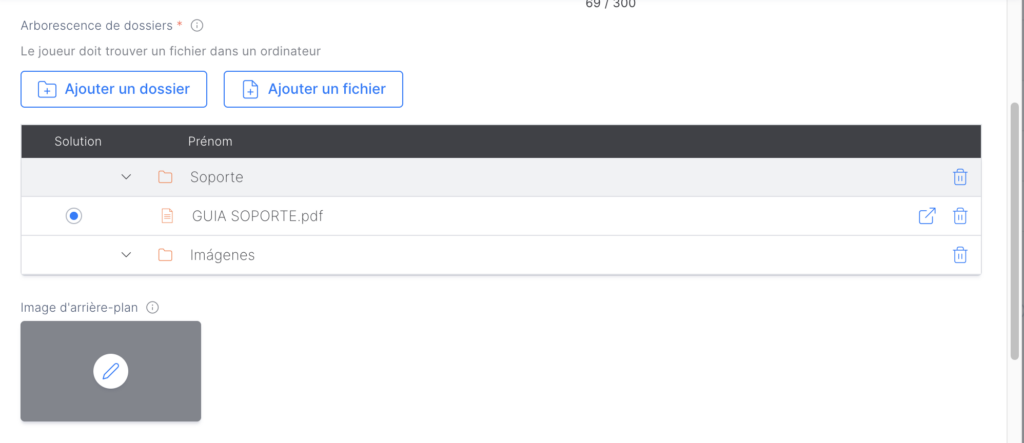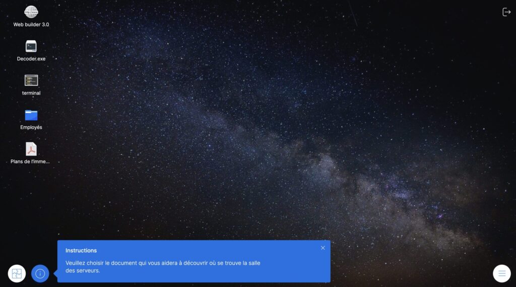 La pièce « Mini jeu – Explorateur de fichiers » permet au joueur de parcourir différents fichiers. Choisissez le fichier « correct » à trouver par le joueur afin de compléter le mini jeu.