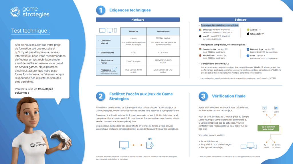 Pendant le processus d’Onboarding, il est très important de vérifier que tout fonctionne correctement avant le lancement des jeux. C’est pourquoi, Gamelearn vous demandera d’effectuer un bref test technique afin de vérifier que les communications ne sont pas bloquées par votre réseau interne et que vos employés peuvent accéder aux liens des jeux.